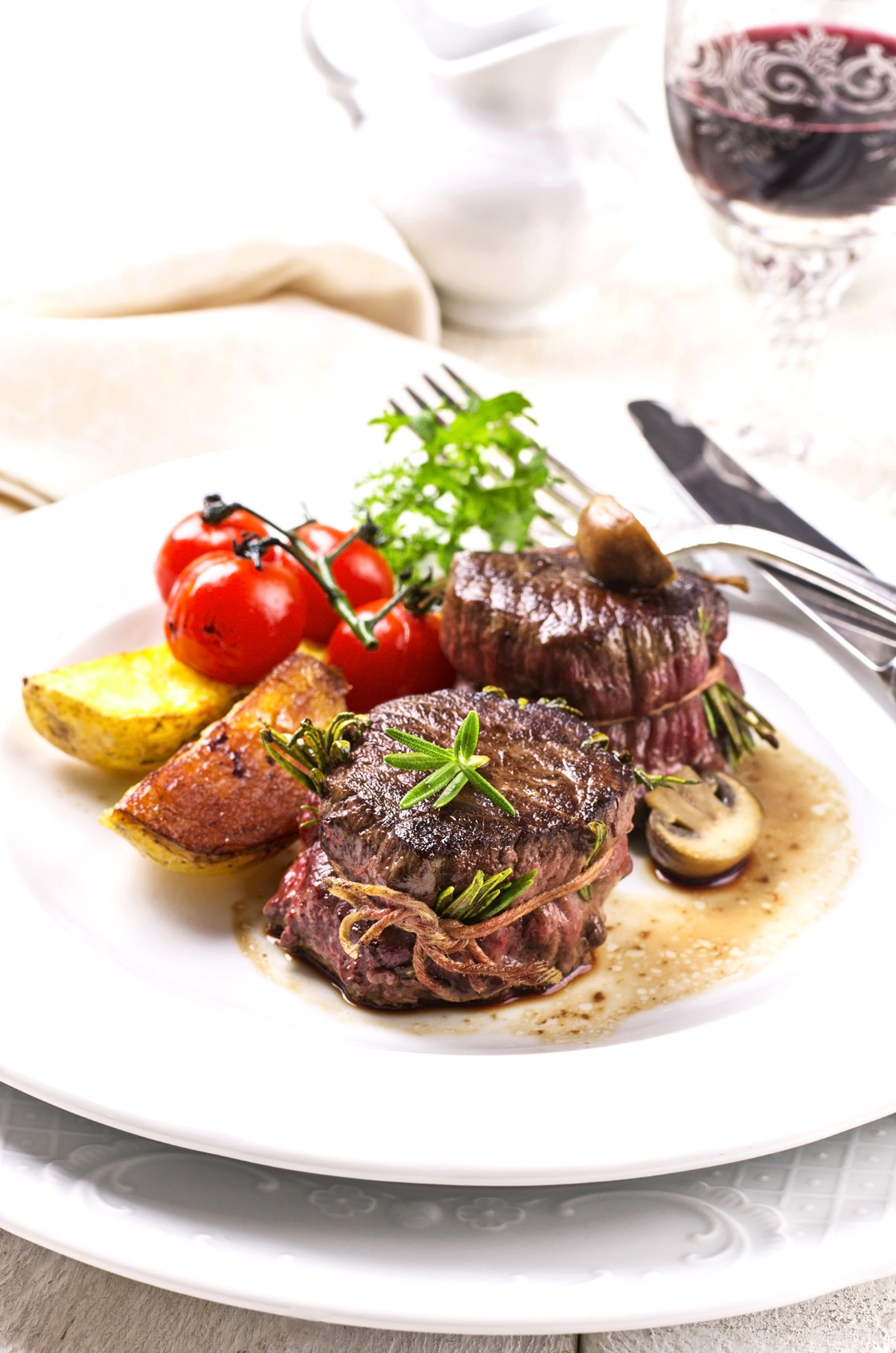 Tournedos sind kleine, zarte Rinderfiletstücke, die wir hier lecker mit aromatischem Rosmarin gespickt haben. Dazu gibts krosse Ofen-Kartoffeln und Pilze in Weißweinsoße.