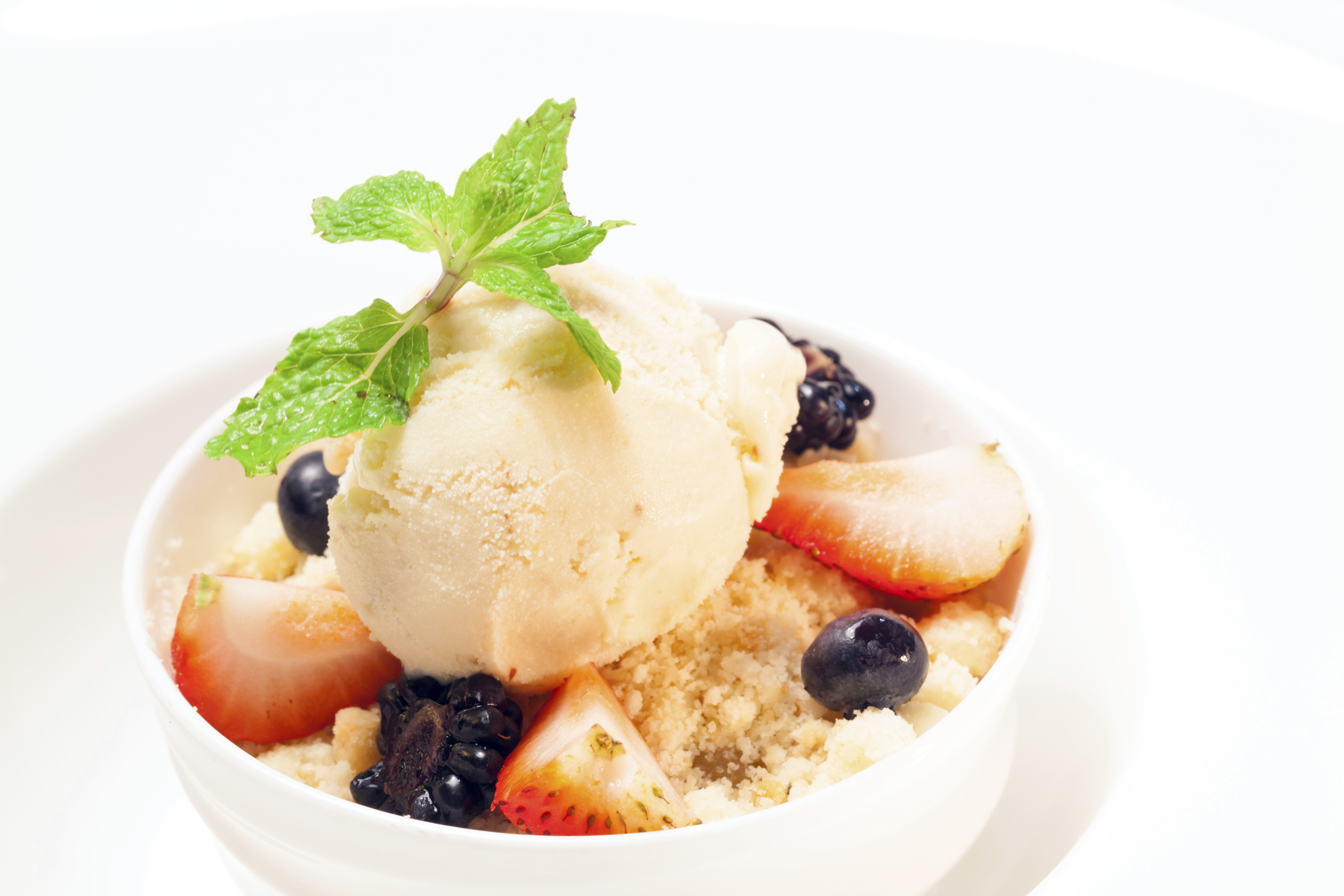 Nach Belieben Vanilleeis und frische Beeren dazu.