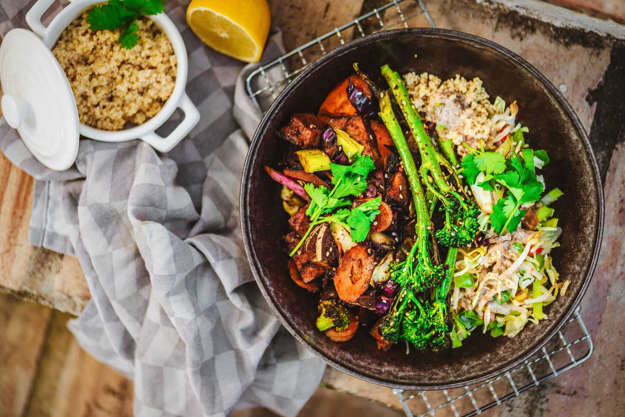 Bowls gehen einfach immer – prall gefüllt mit Couscous, einer Auswahl an buntem Gemüse und Seitan – einer veganen Fleischalternative aus Weizeneiweiß, die in der japanischen Küche sehr beliebt ist – vereint sich die Asia-Bowl zu einer köstlichen und ausgewogenen Mahlzeit!