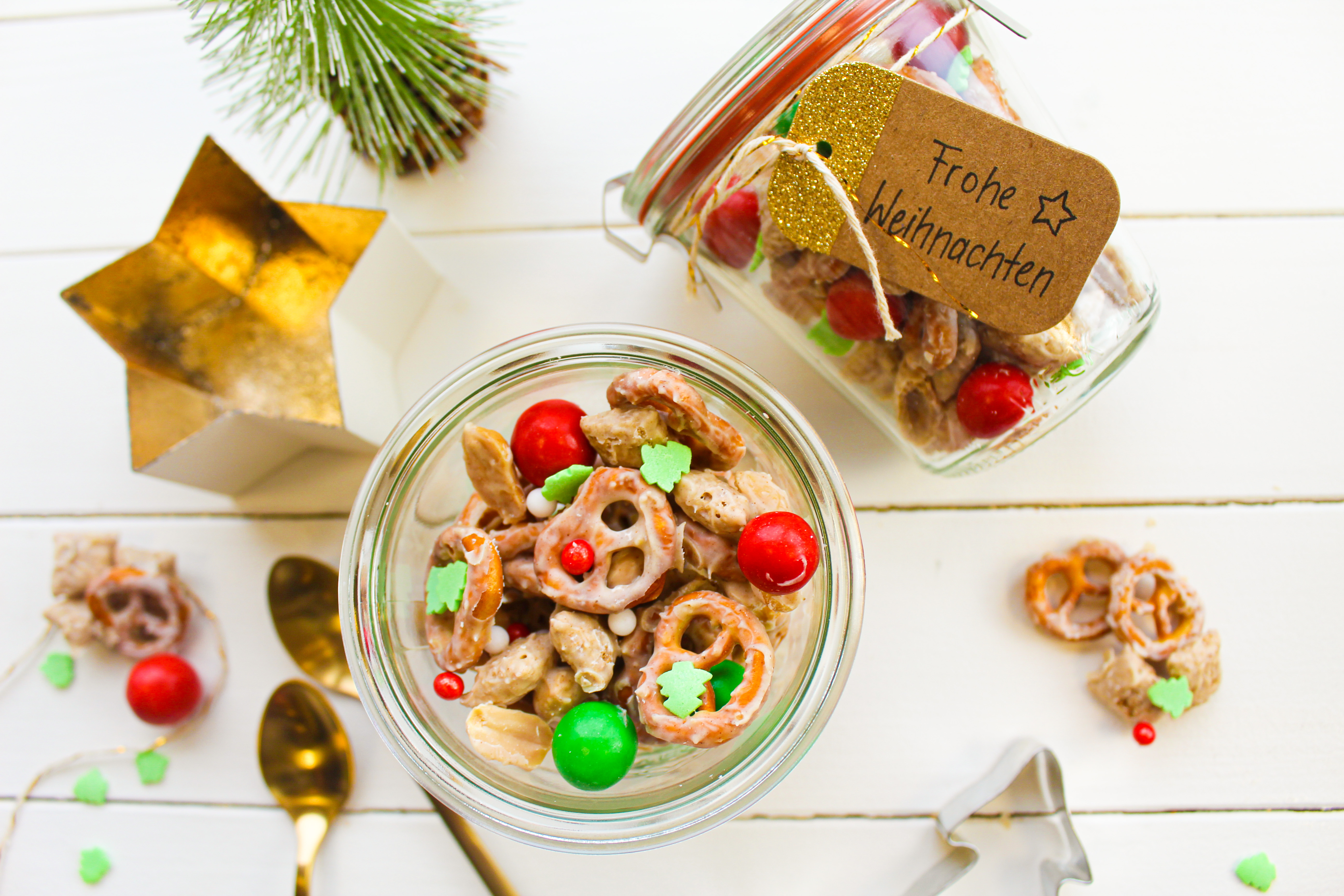 Wenn süß auf salzig trifft, entsteht etwas ganz Wunderbares! Beim Christmas Crunch kommen Haferkissen, Salzbrezeln, Erdnüsse und M&M´s zusammen und werden von weißer Schokolade zusammengehalten. Die Möglichkeiten das Ganze aufzupimpen sind dabei endlos. In kleine Tütchen gefüllt macht sich die bunte Leckerei toll als Geschenk aus der Küche!