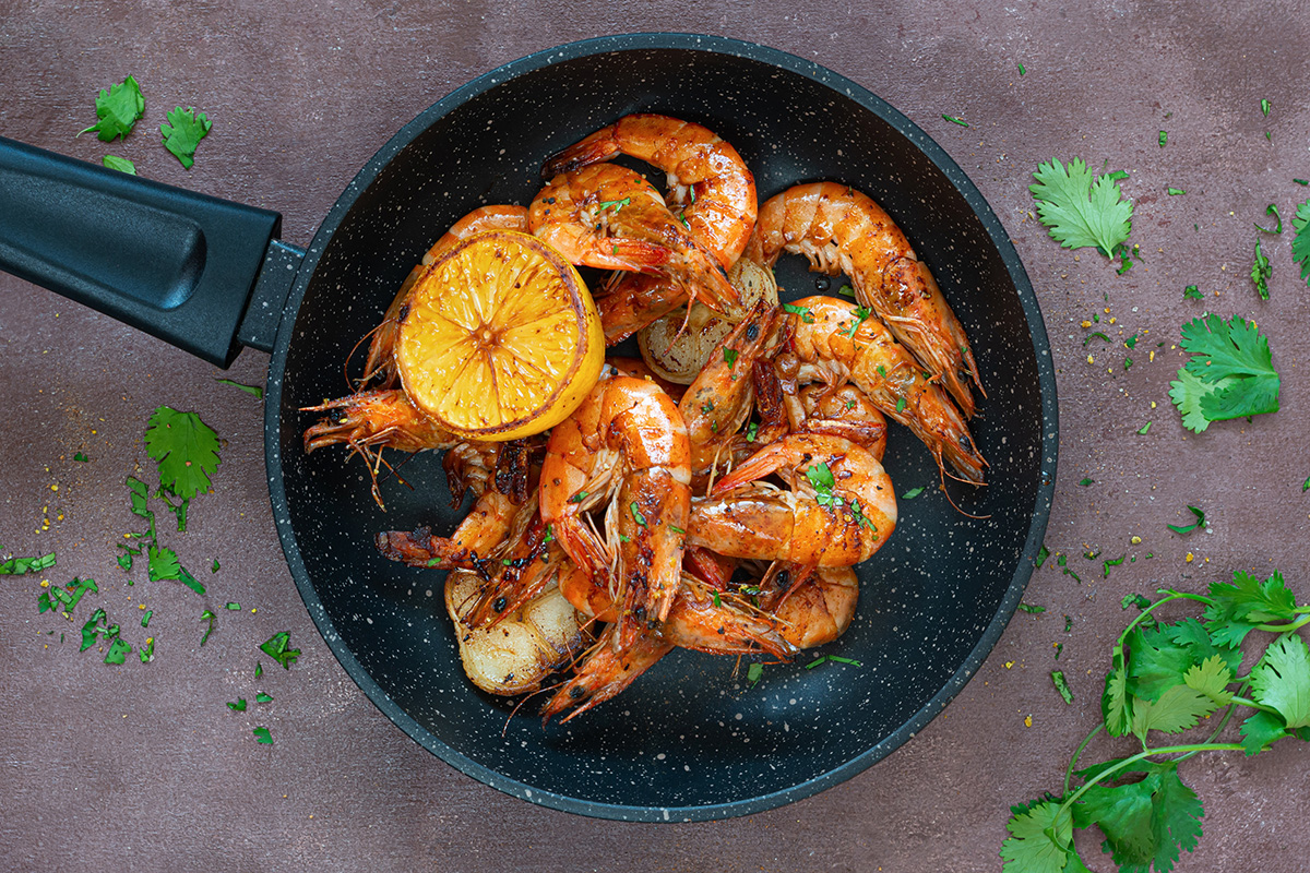 - Eine Pfanne stark erhitzen. Die Garnelen samt Marinade hineingeben und bei hoher Hitze 2–3 Minuten pro Seite braten, bis sie glasig und leicht gebräunt sind. Dabei gelegentlich wenden, aber nicht zu lange garen, sonst werden sie trocken.