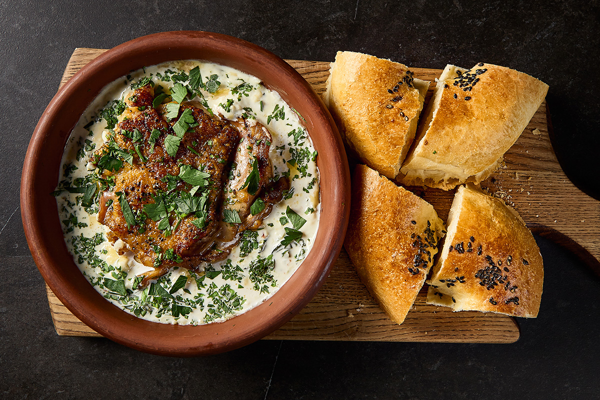 Hähnchen in Walnuss-Kräutersoße (Satsivi) mit Fladenbrot