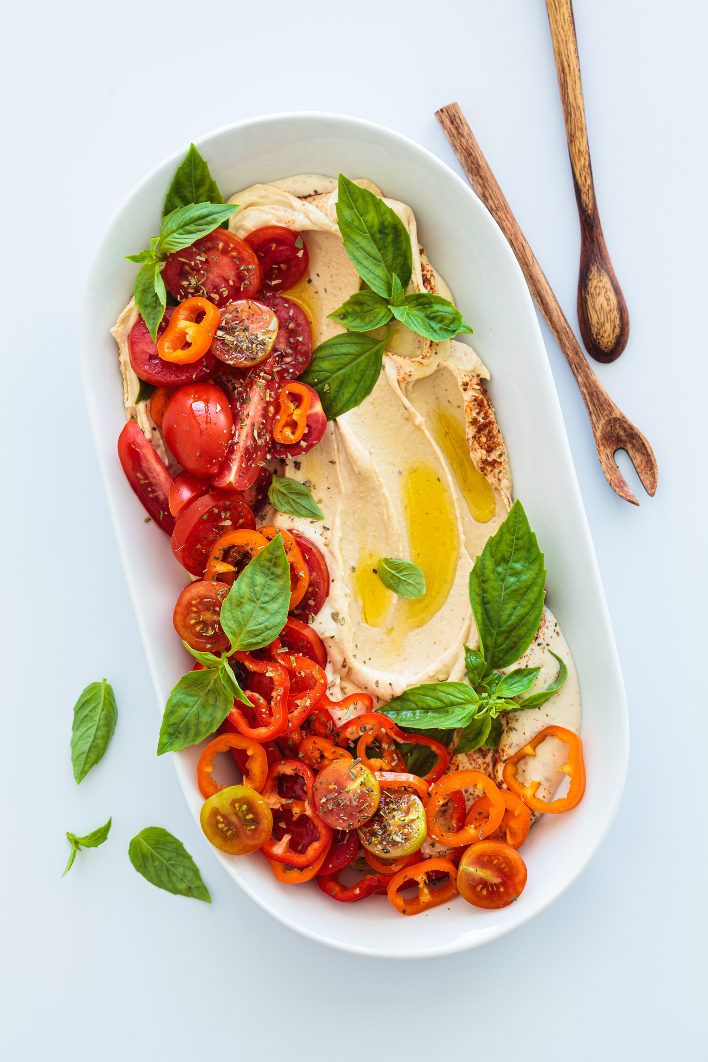- Hummus auf einer Platte mit etwas Olivenöl beträufelt anrichten. Mit Tomaten, Paprika, Zatar sowie Basilikum servieren. Das schmeckt Brot.