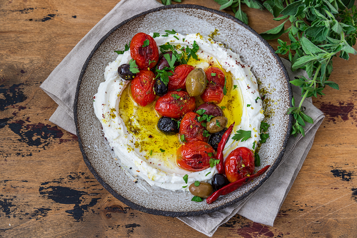 - Die warmen Tomaten samt Oliven vorsichtig auf dem Joghurt verteilen. Nach Wunsch mit etwas zusätzlichem Zatar und Olivenöl verfeinern. Zum Joghurt-Dip passt Fladenbrot.