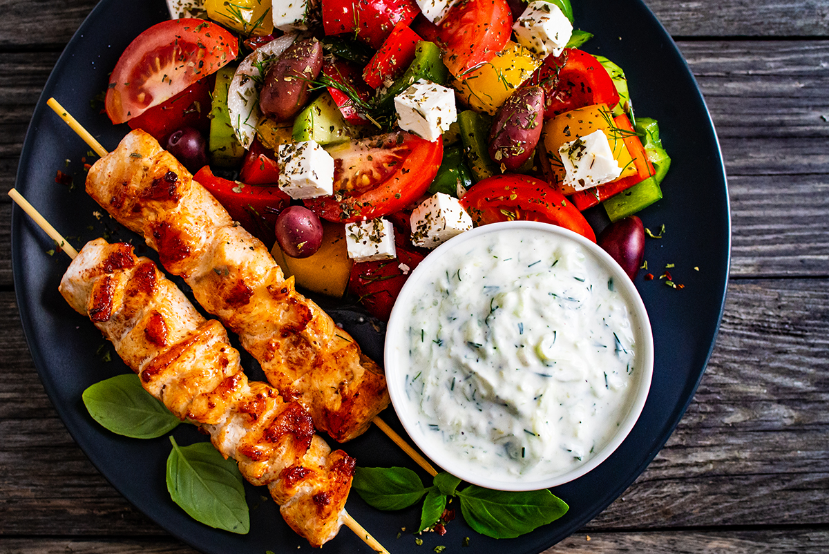 - Souvlaki mit Salat, Tsatziki, warmem Pitabrot und Zitronenspalten auf einem Holzbrett oder Teller anrichten.